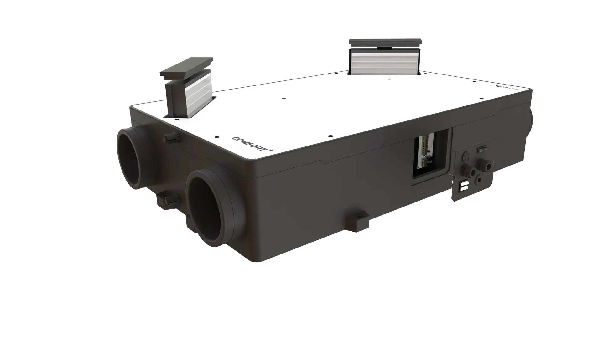COMFORT+ ir COMFORT valdymas leidžia visiškai sureguliuoti rekuperatoriaus veikimą. Valdiklis prie įrenginio jungiamas kabeliu su RJ45 jungtimis (10 m yra komplekte ) - taip užtikrinamas paprastas ir saugus ryšys. Valdiklį galima išplėsti į WIFI modulį ir viską patogiai valdyti per interneto programą. Įrenginį taip pat galima prijungti prie BMS.